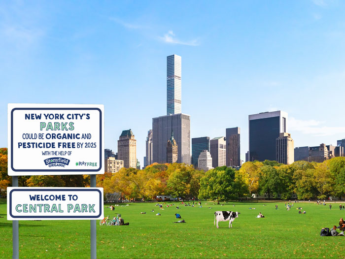 LONDONDERRY, N.H.- -Stonyfield Organic, the country’s leading organic yogurt maker, has been obsessed with fields for almost 40 years. Providing green, organic pastures for its beloved cows, such as Little Flower and Liberty, to roam and graze has been a priority for the brand since 1983. However, Stonyfield realized that organic fields can have an even bigger impact on people, pets and the planet beyond its own. That’s why Stonyfield launched the StonyFIELDS program in 2018, a nationwide initiative to help keep families free from harmful pesticides in parks and playing fields across the country. To further the impact of its program, Stonyfield Organic announces today its goal to help convert the world’s most famous parks, Central Park in New York City, Prospect Park in Brooklyn and Grant Park in Chicago, to be organically maintained by 2025 through several donations. By the end of April, Grant Park will be the first of the parks to begin the organic transition as part of the #PlayFree initiative.