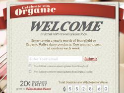Everyone who visits www.celebratewithorganic.com can enter once a week to win a year of free Stonyfield or Organic Valley products, as well as one grand prize of one year's worth of products and a $1,000 gift certificate to Cooking.com-a leading online kitchenware retailer. For each person that enters the contest, the companies will donate 10 cents each to Wholesome Wave (a total of 20 cents per entry). The minimum donation will be $30,000, and with enough consumer votes, a total of $50,000 could be donated.