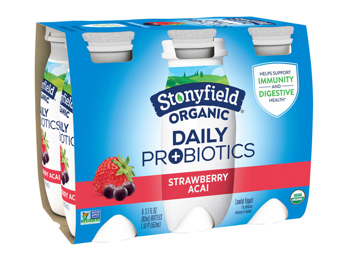 LONDONDERRY, N.H. — Stonyfield Organic, the country’s leading organic yogurt maker, announced today the launch of Daily Probiotics, a probiotic yogurt drink in a 3.1oz easy-to-drink format designed to support both immune and digestive health.* Available in two flavors, Blueberry Pomegranate and Strawberry Acai, the new Daily Probiotics are made with real fruit and organic low fat milk, all for only 60 calories. Stonyfield’s latest innovation comes as the increasing consumer interest in preventive daily healthcare continues to fuel demand for convenient products made with probiotics, with the global probiotics market predicted to reach nearly 80 billion dollars by 2025.1