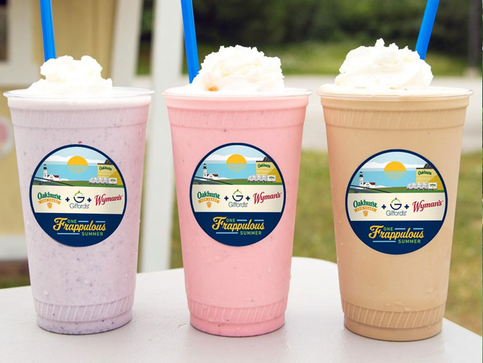 PORTLAND, ME – There truly is nothing like summer in Maine…and to celebrate this extra sweet time of year, three iconic Maine brands–Oakhurst Dairy, Gifford’s Ice Cream, and Wyman’s–are partnering to bring customers one frappulous summer in honor of Oakhurst’s 100th anniversary. During the month of July (National Ice Cream month), visitors to Gifford’s five family-owned stands will be able order three delicious frappes that showcase ingredients from the three Maine companies. Each frappe flavor has been hand-picked by the company’s leaders based on their favorite flavored milk, ice cream, and Maine’s native fruit. To further celebrate Oakhurst’s anniversary, Gifford’s plans to engage consumers at its stands and encourage contributions in support of the Oakhurst After School meal grant program. Both Gifford’s and Wyman’s will match what customers donate up to $1000 each, and the funds will be directed to Full Plates Full Potential–the non-profit organizations that administers the after school meal grant program funding.