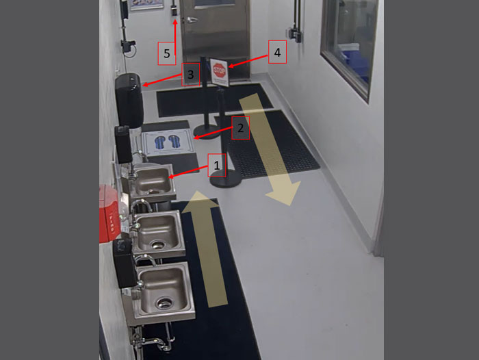 The UVZone Shoe Sanitizing Stations use an exclusive combination of Ozone+UVC light via Corning® HPFS® Fused Silica (High Purity Fused Silica). The units are placed at the facility’s critical hygiene transition zones to improve biosecurity by eliminating germs carried in on shoes to floors.
