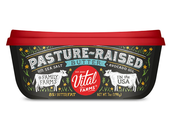 To create the spreadable tub butter, cream is sourced from rich pasture-raised milk produced on family farms in Georgia, Florida, and Ohio. Vital Farms partners with sixth generation butter-makers to then churn the cream into pasture-raised butter with 85% butterfat content. As the final step, the creamy pasture-raised butter is blended with 100% pure avocado oil and sea salt. Like the hens that lay Vital Farms’ shell eggs, the cows that produce the milk are pasture-raised. Each cow enjoys outdoor access year-round to graze on pasture and eats a balanced diet of natural forages like grass and hay along with supplemental vitamins, minerals, and grains to support their overall health.