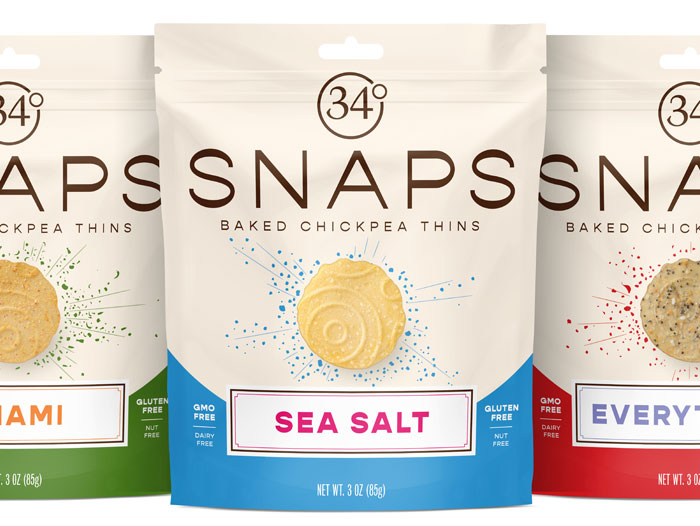 DENVER—34 Degrees, makers of light, crunchy crisps ideal for entertaining and snacking, today announced it will debut Snaps, a delicious new flavor-forward line of baked chickpea snacking thins, at Natural Products Expo West 2020. Available in three savory varieties including Sea Salt, Everything and Umami, Snaps deliver a unique new snacking experience that’s naturally gluten free through the use of steamed chickpea flour. Attendees of the show will be the first to taste and experience the new snacks at booth #N1038.