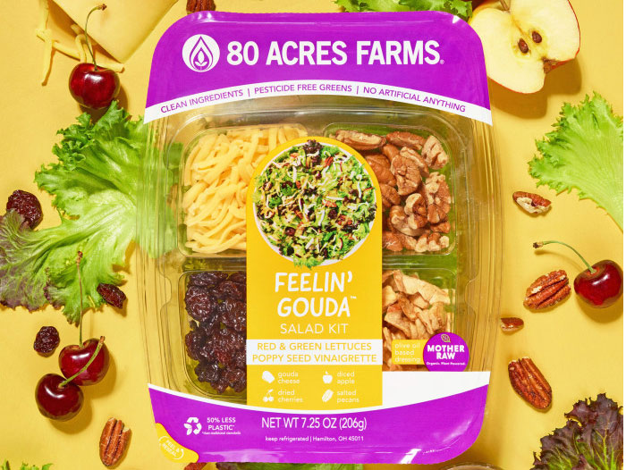 HAMILTON, OH – 80 Acres Farms, an industry-leading vertical farming company, is announcing its first foray into grab-and-go fresh meals. Starting this month, consumers will be able to find the company’s ready-to-eat salad kits at more than 200 locations in Ohio, Illinois, Kentucky, and Tennessee.