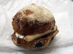 First up, a cranberry-walnut roll, split, drizzled with olive oil and paired with True Blue (first photo at top), a raw cows' milk from Woodcock Farm Vermont. It's an ideal match—an intensely rustic blue, gorgonzola-rich, pressed against the sweeter cranberry- and nut-studded roll. Next was Landaff, also a raw cows' milk cheese, from New Hampshire. It's a very tangy cheese, semi-firm, buttery in tetxure and coupled with a crusty kalamata olive roll. Imagine just how delightful it would be to return on a daily basis for a combination—now that's my idea of a sandwich.