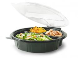 The new 9” 3-compartment joins the 1-compartment 6”, 7.5”, and 9” deep and shallow packages from 14 to 40 ounces, sized perfectly for small and larger portion sizes. The one-piece, hinged black bottom containers drive impulse sales with their clear RPET lid. The unique cold temperature anti-fog technology in the lid maintains maximum visibility while on display. The elimination of condensation while in the refrigerated case gives the food that “just made” appearance, even when packed at a central kitchen. The leak-resistant lid eliminates messy spills and keeps the operation running smoothly with an audible quick-snap closure.