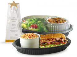 Embraceable is an 11” x 8” black, oval platter designed and patented with a locator ring in the bottom to hold a standard 8 ounce squat paper food container. This popular serving size is used for chili, soups, oatmeal, grits, mac & cheese, and many other items that often accompany a main dish, sandwich, or salad. The clear, anti-fog, vented PP lid contains an integral sealing flange that forms a lid over the paper container at the same time that it forms a leak-resistant seal on the platter. This eliminates the lid for the paper container, which saves expense and reduces the amount of packaging consumed, thereby reducing carbon footprint. It also improves consumer convenience, as the meal may be carried in one single container, rather than two.