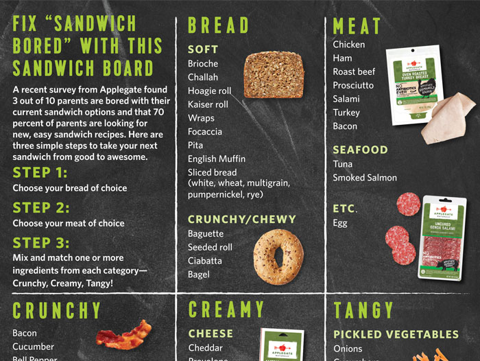 This back-to-school season, Applegate is battling lunch-making boredom with its “Lunching Awesome” campaign, sharing crave-able sandwich recipes and offering a simple sandwich guide that identifies the key components of a great sandwich.