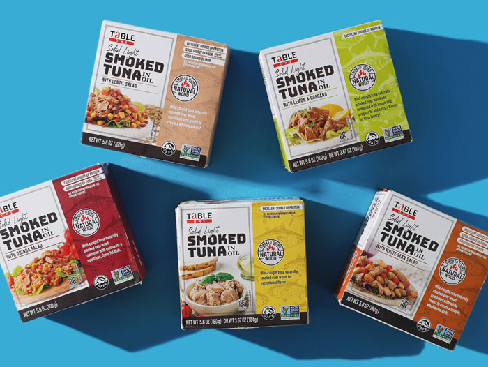 Products in the line include smoked tuna in soybean oil, smoked tuna in soybean oil with lemon and oregano, and three smoked tuna blended salads that are 25%