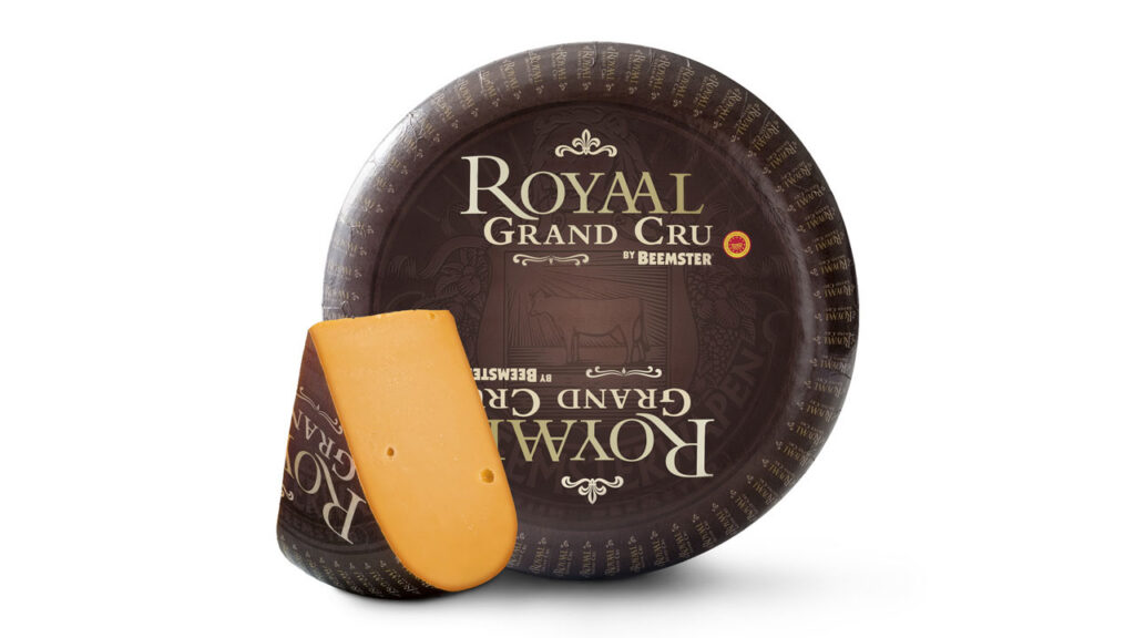 Royaal Grand Cru is a PDO North Holland Gouda made at the CONO Kaasmakers dairy in the heart of the Beemster Polder in the Netherlands. The cheese has a firm, dense texture with tasty crystallization that develops from the year-long natural aging. The flavor carries the iconic nuttiness of traditional Gouda, alongside sweet toffee notes. Beemster developed the Royaal recipe to honor its appointment as Purveyor to the Royal Court of the Netherlands — a distinction granted only to companies that are at least 100 years old, regionally significant, and reflective of Dutch culture.