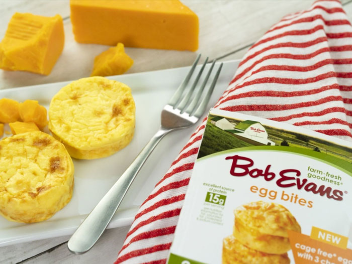 The new Bob Evans Egg Bites are delicious, filling, cage-free egg bites fresh and ready to heat-and-eat in a versatile microwaveable tray. Each package comes with two in a pack. There are three varieties: Cheese, Bacon & Cheese, and Bob Evans Sausage & Cheese. The low-carb Egg Bites have 15 to 17 grams of protein in each 2-bite serving, providing long-lasting fullness.