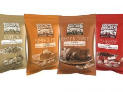 PHOENIX — In the spirit of the most anticipated meal of the year, Boulder Canyon Foods introduces Thanksgiving Feast, a new line of kettle-cooked potato chips inspired by the flavors of the season. Thanksgiving Feast includes chip flavors such as Turkey & Gravy, Stuffing, Cranberry and Pumpkin Pie. The complete 10-ounce bag contains four separate 2.5-ounce potato chip bags packaged together in a plastic outer bag that mimics the look and shape of a traditional store-bought turkey.