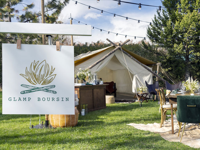 Like the thrill of unwrapping a new box of Boursin, Glamp Boursin opens a world of inspiration that can transform any outdoor experience into a gourmet getaway—all set against the glow of an open fire. The immersive backyard oasis features:
