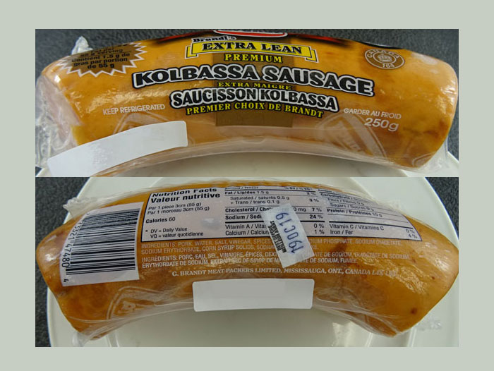 Ottawa – G. Brandt Meat Packers Ltd. is recalling Brandt brand Extra Lean Kolbassa Sausage from the marketplace due to possible Listeria monocytogenes contamination. Consumers should not consume the recalled product described below.