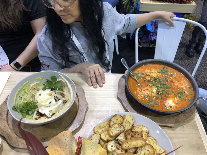 Hummus + Minted Avo Almost Vegan Bowl a la Cubana featured Sabra Classic Hummus, Haas avocado with mint, picadillo seasoned with cumin, turmeric, and parsley, caramelized onions and garlic mojo, topped with mystery ingredients which included a fried egg from Handsome Brook Farmand Impossible Burger selected from a basket during the 20-minute challenge. Runner up Gina Matsoukas (Running to the Kitchen) made a Hummus Shakshuka and included ExpoWest NEXTY-nominated Picaflor Live-Culture Srirawcha Hot Sauce.