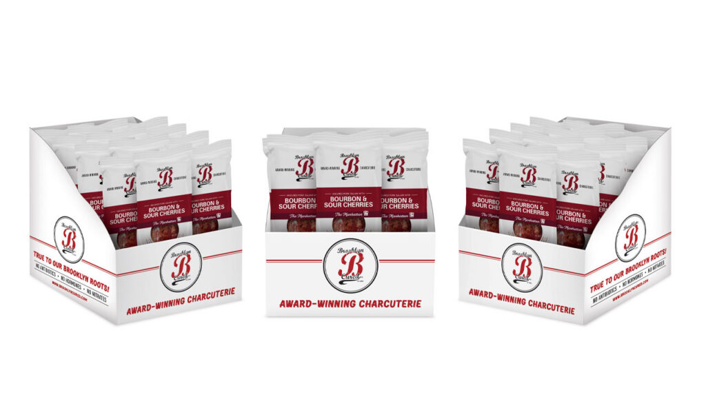 The branded cases feature a perforated top that can be torn off to display 12 units of product. Important product attributes and noticeable brand elements, like Brooklyn Cured’s logo and colors, are printed on the outside of each case.