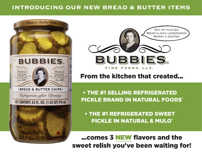 Bubbies original Bread & Butter Chips are already the number one refrigerated sweet pickle in both the “Natural” and “Multi Outlet with Convenience Stores” (MULO) channels. With three new flavors – Spicy, Horseradish, and Ginger Apple – Bubbies is offering premium variety to a growing sweet pickle category. Each new Bread & Butter Chip flavor is made with real ingredients clearly visible through the 25 oz glass jar, including Fresno chili peppers, horseradish root, ginger pieces, and Granny Smith apples.