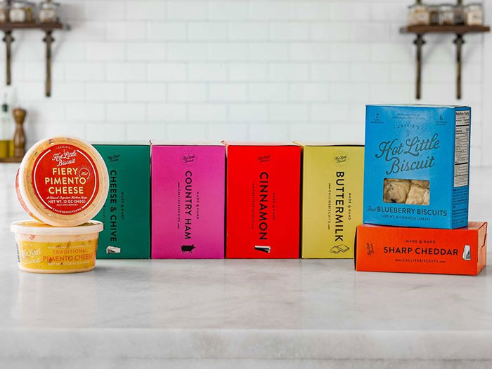 The rebranded line includes 6 varieties of frozen ready-to-be-reheated biscuits (Buttermilk, Cheese & Chive, Country Ham, Sharp Cheddar, Blueberry, Cinnamon), Cocoa & Cream Cookies, Traditional Pimento Cheese, Fiery Pimento Cheese and a variety of pantry items like Cheese Crisps, Buttermilk Biscuit Mix and a line of jams and honey. Bold and colorful, the vibrant new biscuit boxes are smaller and more efficient for shipping, but the signature “hot little” biscuit size remains the same. “Our customers tell us that Callie’s Hot Little Biscuit has a sunshine effect. It’s hard not to smile when you walk up to our eatery window and see a baker rolling and stamping fresh biscuits. Our goal is for the vibrant new boxes to evoke that same feeling in stores and at home,” shares Morey.