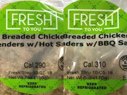 The breaded chicken tenders with BBQ sauce and hot sauce items were produced and packaged from Sept. 7, 2018 through Oct. 4, 2018. The following products are subject to recall: [View Labels (PDF only)]