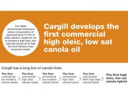 Cargill has established a long history of gathering market insights to deliver first-to-market specialty canola oils that meet the food industry's nutritional and performance needs. Prior to the high oleic, low saturated canola oil, Cargill introduced the world's first low linolenic canola oil in 1992, the first high oleic canola oil in 1993 and the first commercial 80 percent high oleic canola oil in 2011.