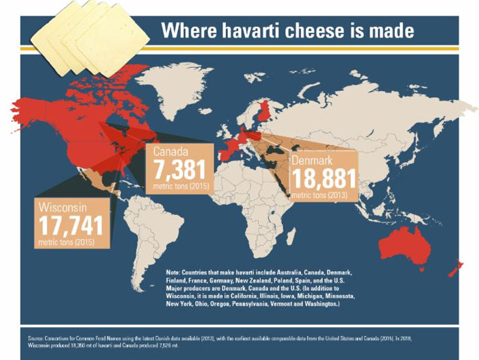 Less than half of the world’s havarti is made within Denmark, according to CCFN estimates; other major producers include the United States and Canada, with additional production in Australia, New Zealand, and in other European nations such as Germany. (See infographic.)