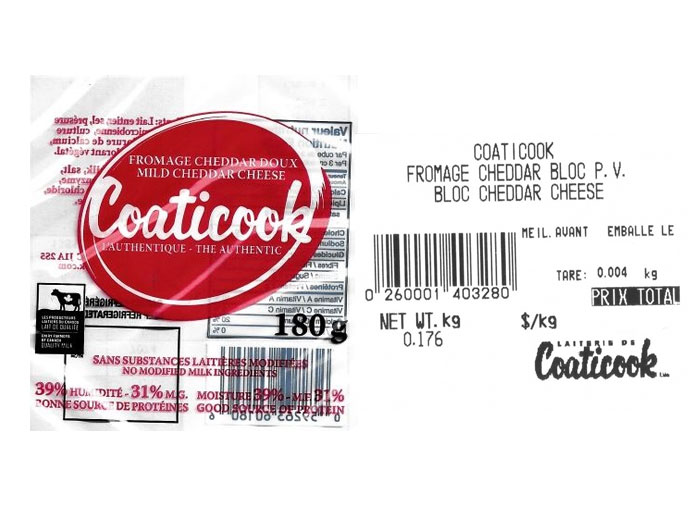 | Coaticook | Bloc Cheddar Cheese | Variable | Starting with 0 260001 | Best Before: 03MR20 |