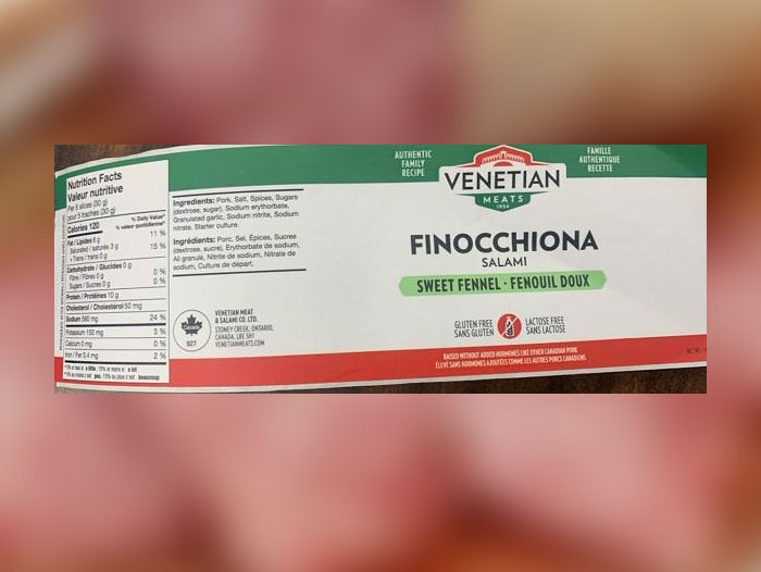 CFIA: Venetian Meats brand Finocchiona Salami Sweet Fennel recalled due to Salmonella