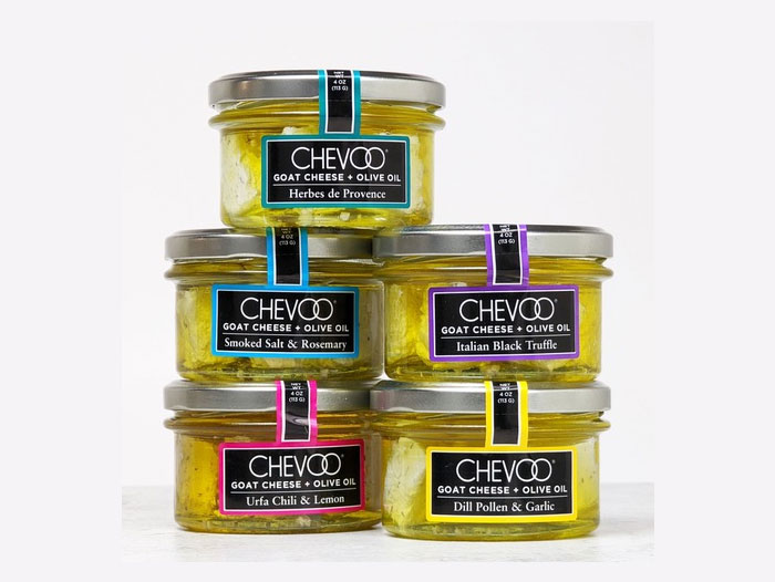 CHEVOO’s product range consists of five flavors of marinated chevre cubes – including new Herbes de Provence – all sold in 4-oz glass jars: