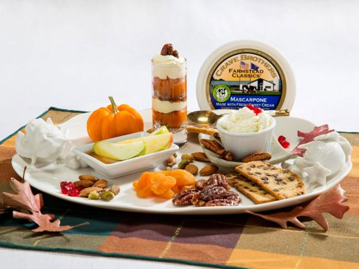 4. Create fun fall gatherings with memorable desserts. Seasonal dessert cheese boards are ideal for football parties or Thanksgiving celebrations. Offer fall flavors like Pumpkin Tiramisu Parfaits made with Crave Brothers Mascarpone, and apple slices with Sweet and Savory Apple Cheesy Dip. The dip blends apple butter, grated sharp cheddar cheese and Crave Brothers Mascarpone. Add dried fruit, spiced pecans, and biscotti to the cheese board to complete your dessert course.