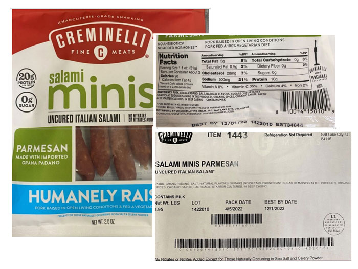 2.6-oz. plastic pouches containing “CREMINELLI FINE MEATS salami minis UNCURED ITALIAN SALAMI PARMESAN” with “BEST BY” dates from 06/18/22 through 12/09/22.