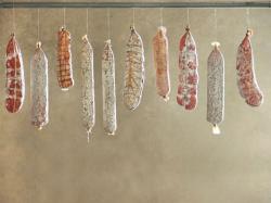 Sopressa veneta – The traditional sopressa comes from the Veneto region in Italy. It is robustly redolent of garlic and red wine, and is hand-tied with thick hemp cord in a large crescent-shaped natural casing.