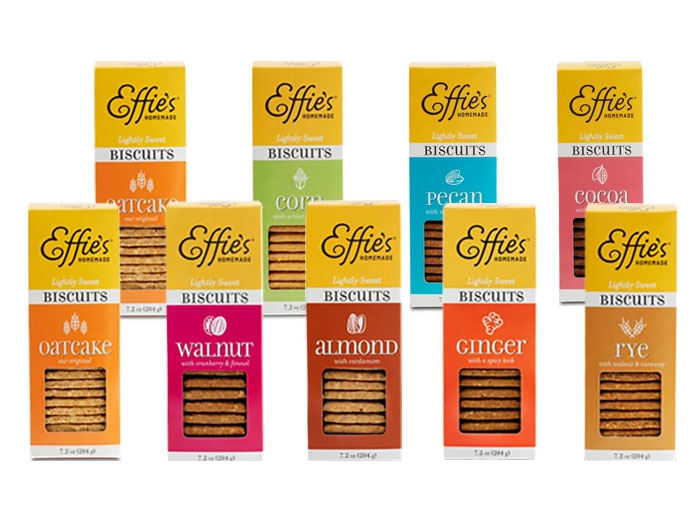 Effie’s Homemade was founded in 2007 by friends, Joan MacIsaac and Irene Costello. The inspiration for the company comes from Joan’s mother, Effie MacLellan, and her farmhouse family recipe for Oatcakes. By rekindling old-fashioned and forgotten recipes, Effie’s Homemade has created a line of rustic baked goods that are delicious and wholesome. In a world of highly processed foods, Effie’s Homemade turns quality ingredients into great tasting biscuits suitable for any occasion.