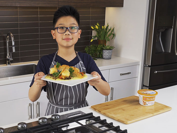 TORONTO – Fried bocconcini balls plated over creamy polenta with mushrooms and thyme-roasted tomatoes sounds like a dish designed by a master chef – but this stunning recipe came from 11-year-old Victor Chow! Victor wowed the judges from Food Network Canada’s Junior Chef Showdown during the recent “Big Cheese” episode, winning a cash prize of $5,000.00 awarded by Canada’s own Tre Stelle Cheese.
