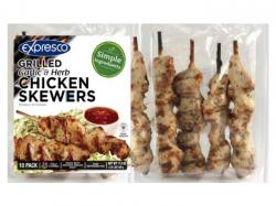 - 1.09-lb. packages of “EXPRESCO GRILLED Garlic & Herb CHICKEN SKEWERS” containing the UPC code 621588315555 with lot codes: 172563, 172668, 172669 and 172670.