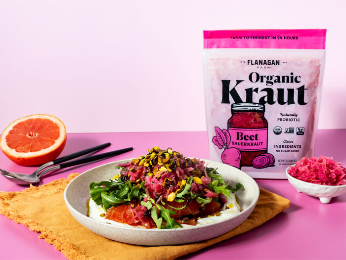 Flanagan Farm brings the timeless art of fermentation to every table with their fresh, organic sauerkrauts. Flanagan Farm’s kraut is the most affordable organic sauerkraut that is widely available. Flanagan Farm sauerkraut is made with simple, clean ingredients like dill, garlic, ginger, caraway, and sea salt. The portfolio includes four flavors: Classic, Caraway, Beet and Dill.