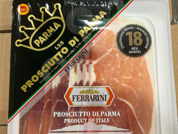 • 4-oz. vacuum-sealed plastic tray packages containing slices of “FERRARINI PROSCIUTTO DI PARMA PRODUCT OF ITALY” and lot code “2527642” on the backside label of the packaging.