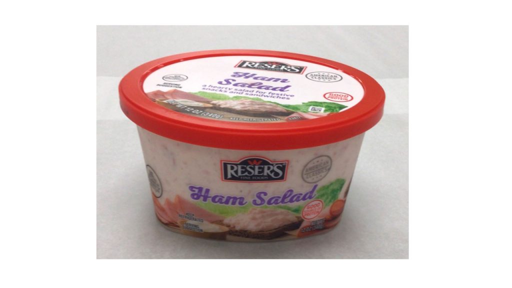 - 12-oz. printed plastic tubs containing “RESER’S FINE FOODS Ham Salad” with sell by dates of 09/01/25.