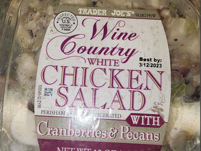 - 12-oz. clear plastic trays containing “TRADER JOE’S Wine Country WHITE CHICKEN SALAD WITH Cranberries & Pecans.” with a best by date of 3/12/2023.
