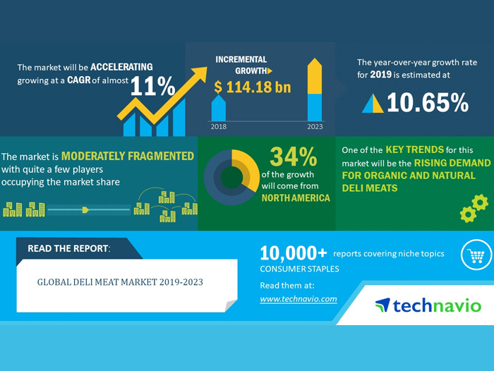 LONDON– The global deli meat market research report by Technavio predicts the market to post a CAGR of nearly 11% during the period 2019-2023.