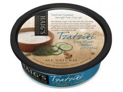 - Tzatziki is a Greek Yogurt, cucumber and dill dip/spread which is packaged in 8oz retail round deli containers and 5lb bulk foodservice cases.