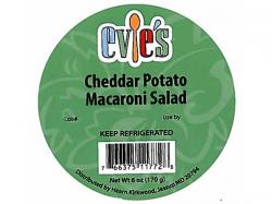 The recalled product was sold in 6.0 oz. clear plastic containers with the name “Evie’s Cheddar Potato Macaroni Salad,” UPC code 6637511772” and “use by” dates of 04/15/16 to 06/20/16.