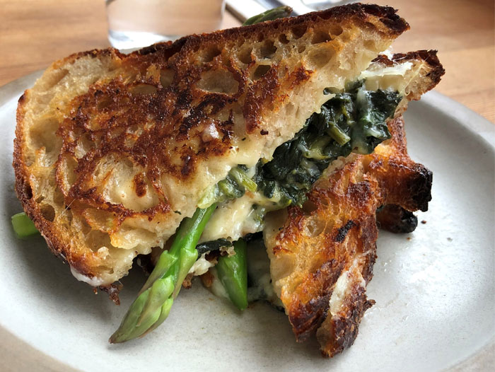 Executive Chef Christa Chase of Tartine Manufactory in San Francisco adds a Mornay sauce to her grilled cheese sandwich. Christa says, “Our current version is cheese, Mornay, asparagus, fava greens, mint and spring onions on Tartine Country bread. The Mornay adds another layer of creamy richness that I think really brings it to another level, and frankly is just another way to incorporate more cheese!”