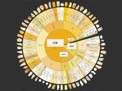 The chart, which the designers call a "cornucopia of cheese," is broken down according to two basic criteria: the animal of provenance and level of hardness that form a fromage’s taste and texture. A little less than three-fourths of the featured cheeses are made using cow milk, while goat and sheep together account for slightly over a quarter of the bunch. (The remaining sliver is made up of two select Buffalo cheeses.) Each type comprises four subcategories of firmness, with each example described as hard, semi-hard, semi-soft, and finally, soft.