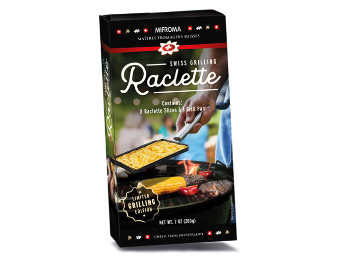 Traditional Sliced Raclette and one barbeclette grill pan. The Traditional Sliced Raclette packages eliminate the need to scrape a half wheel of cheese, allowing customers to enjoy this earthy, lightly sweet cheese in smaller servings. The barbeclette pan can be used directly on a grill at an elevated summer cookout or atop a stove for an easy and adventurous cheese experience in your kitchen or backyard!