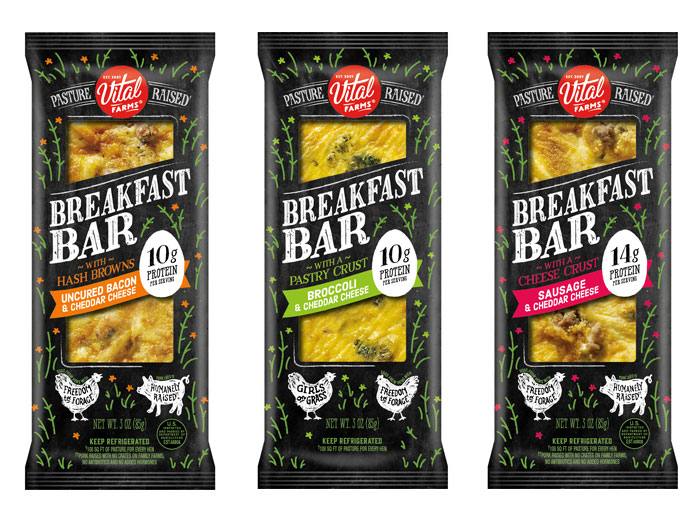 Made with Vital Farms pasture-raised whole liquid eggs, pasture-raised cheese, humanely raised meat and vegetables, with no added sugar, preservatives or fillers, each 3 oz. Breakfast Bar has 7-14 grams of protein and is under 200 calories per serving. Breakfast Bars will be available nationwide at Whole Foods and other retailers beginning this August and come in four varieties, including: