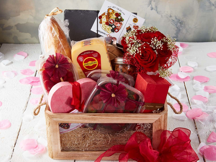 The “Just for Bae” basket includes a BOSKA Holland cheeseboard & mini cheese planer, luscious chocolate-covered strawberries, salamis, fresh bread, several fresh fruits, and more. In keeping with Valentine’s Day tradition, this beautiful plate is garnished with deep red roses. The Easter gift basket, called “Brunch Vibes Only”, will feature Jarlsberg®, nova lox, capers, mini-bagels, cherry tomatoes, and garnished with dill and yellow flowers.