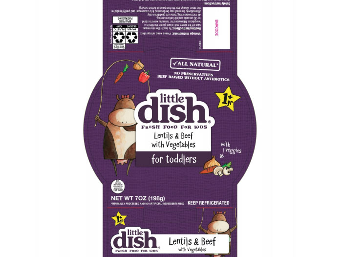 • 7-oz. polypropylene cup with film containing “little dish FRESH FOOD FOR KIDS Lentils & Beef with Vegetables for toddlers” with a best buy date of 1/10/20.