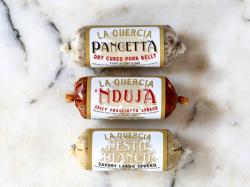 Norwalk, Iowa – La Quercia, the award-winning artisan cured meat producer based in Iowa, announces today its latest project: new spreadable cured meat, Ground Pancetta and Pesto Bianco.  Available in tubes for easy use, similar to La Quercia’s Nduja spread, these meats are ready for creative cooking in the kitchen.  They embody what La Quercia is known for: delicious cured meats from humanely raised and responsibly sourced pork.