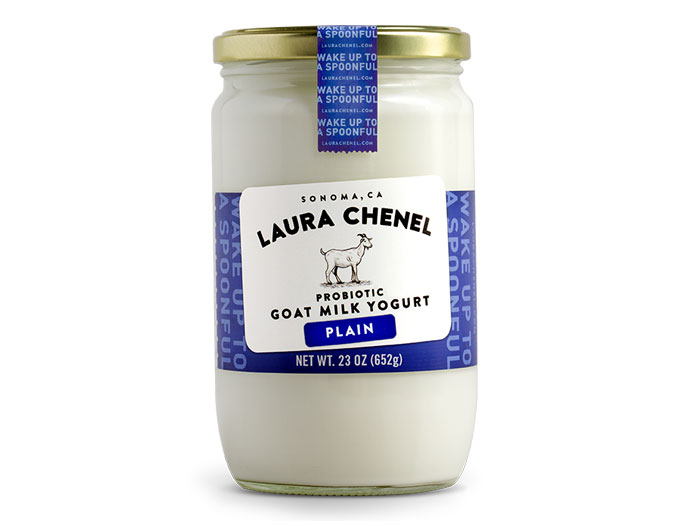 Laura Chenel Probiotic Goat Milk Yogurt Plain — Available in snack-size 4.75-ounce glass jars with gold foil lids or family-size 23-ounce glass jars (re-sealable lid). The fresh, mildly tangy flavor of Plain adds a subtle acidity (as well as probiotics and protein) to any smoothie. Add berries and granola for a family-friendly treat or use it as a substitute for sour cream or crème fraîche in sauces and dips.