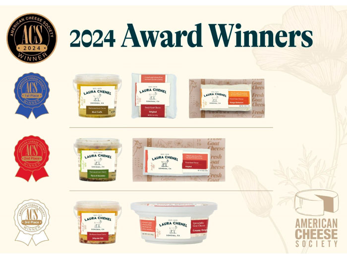Sonoma, California Laura Chenel, America’s trailblazing goat cheese producer, is honored to announce its recent awards recognized at the 2024 American Cheese Society Conference. The American Cheese Society (ACS) is dedicated to promoting artisan, farmstead, and specialty cheeses, and hosts North America’s annual conference showcasing the best of the cheese industry.